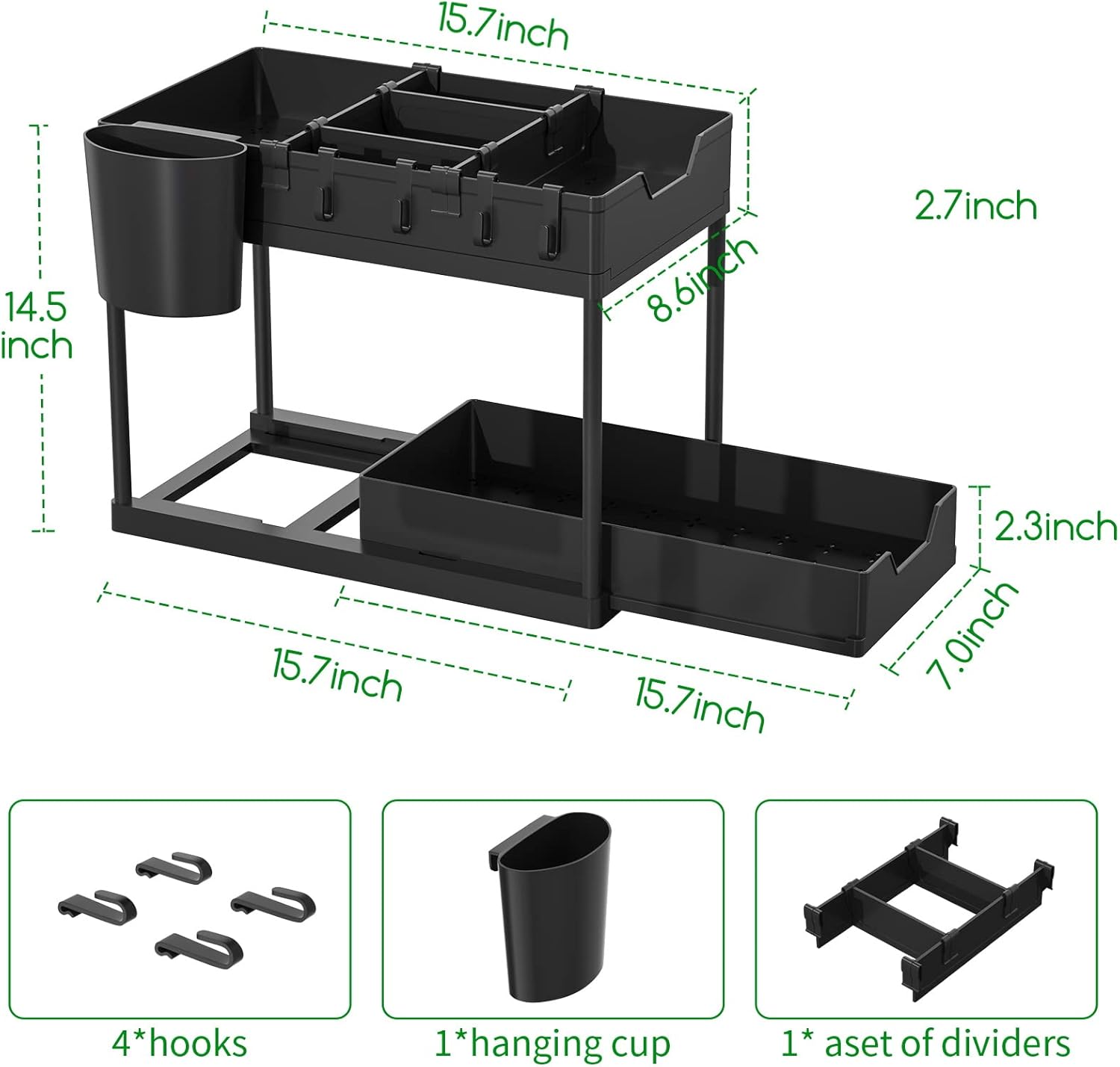 Maximize Space Efficiency: This under sink storage creates two tiers of smart storage, maximizing vertical space under sinks, in pantries, or on countertops. Say goodbye to cluttered cabinets in kitchens, bathrooms, garages, laundry rooms, offices, and storage closets